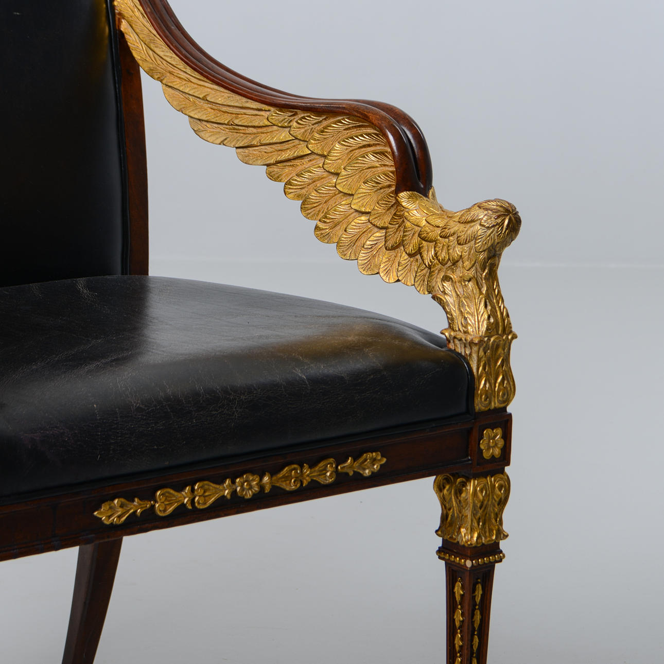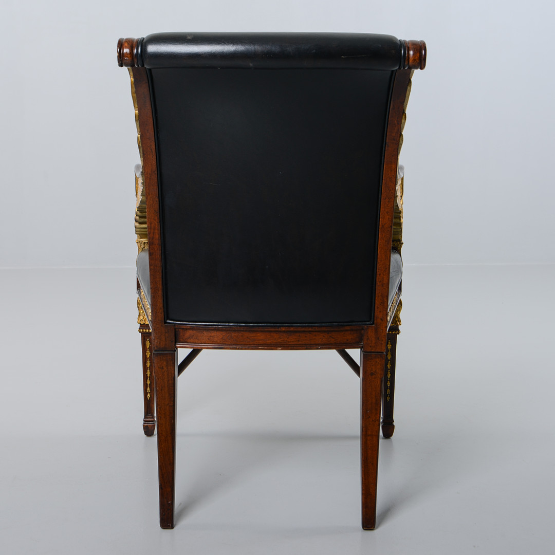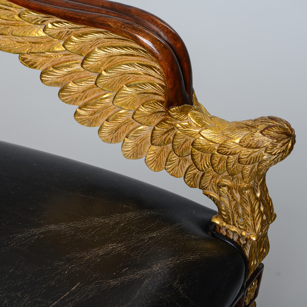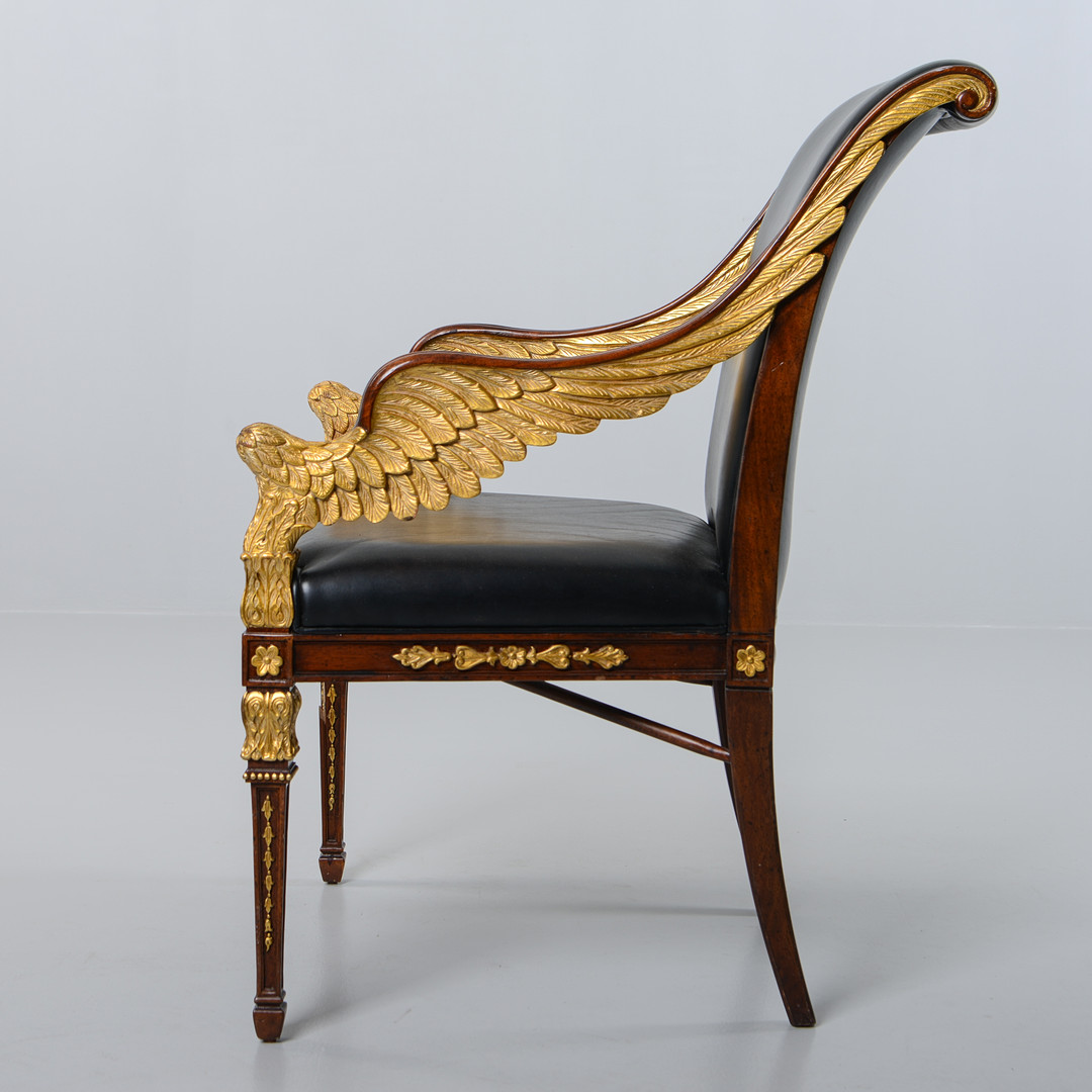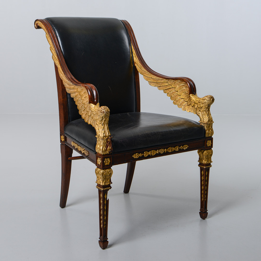 Chiếc ghế bành cổ điển này được thiết kế theo phong cách Empire – Tân cổ điển Pháp, nổi bật với vẻ đẹp quyền lực, sang trọng và tinh thần hoàng gia châu Âu thế kỷ XVIII–XIX.