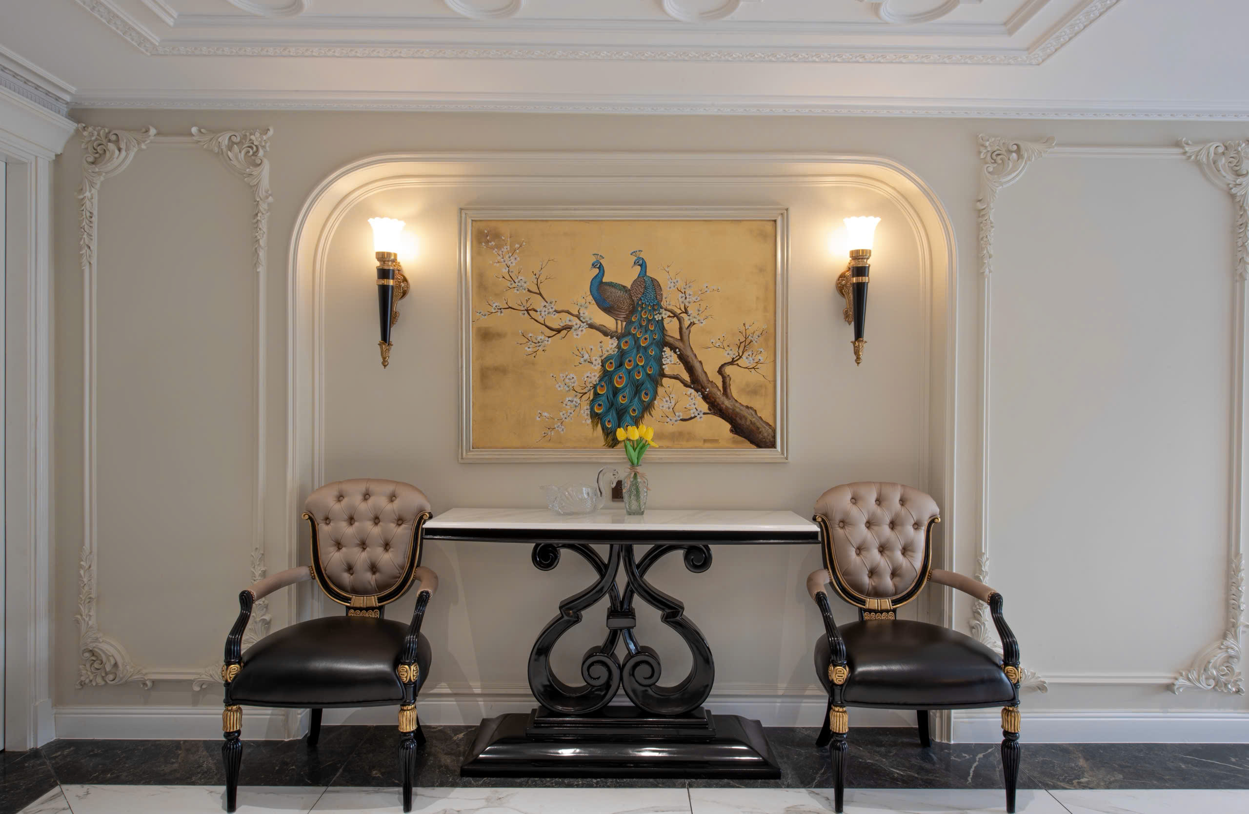 Bước vào bên trong, không gian nội thất mở ra với cảm giác sang trọng, ấm cúng và đầy tính nghệ thuật. Trần cao trang trí hoa văn cổ điển, đèn chùm pha lê ánh vàng lan tỏa ánh sáng dịu nhẹ, làm nổi bật từng đường nét kiến trúc. Nội thất được lựa chọn kỹ lưỡng với các chất liệu cao cấp như đá marble, gỗ sơn đen – dát vàng, da và vải nhung, mang lại cảm giác đẳng cấp và bền vững theo thời gian.