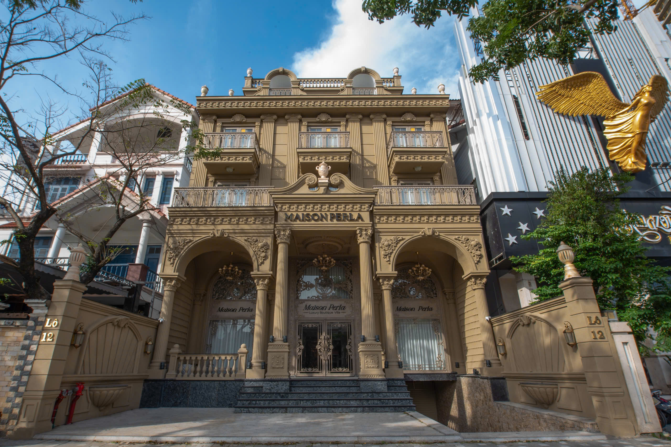 Khách sạn Maison Perla Đà Nẵng được thiết kế theo phong cách tân cổ điển châu Âu sang trọng, nổi bật với mặt tiền hoành tráng, bố cục đăng đối và những hàng cột lớn mang dáng dấp kiến trúc Pháp cổ. Các chi tiết phào chỉ, phù điêu và hoa văn trang trí được chạm khắc tinh xảo, kết hợp gam màu trung tính pha ánh vàng ấm, tạo nên vẻ đẹp quyền quý nhưng không phô trương. Hệ ban công sắt nghệ thuật, mái vòm mềm mại và cửa kính lớn giúp tổng thể công trình vừa uy nghi, vừa thanh lịch, thu hút ánh nhìn ngay từ cái nhìn đầu tiên.