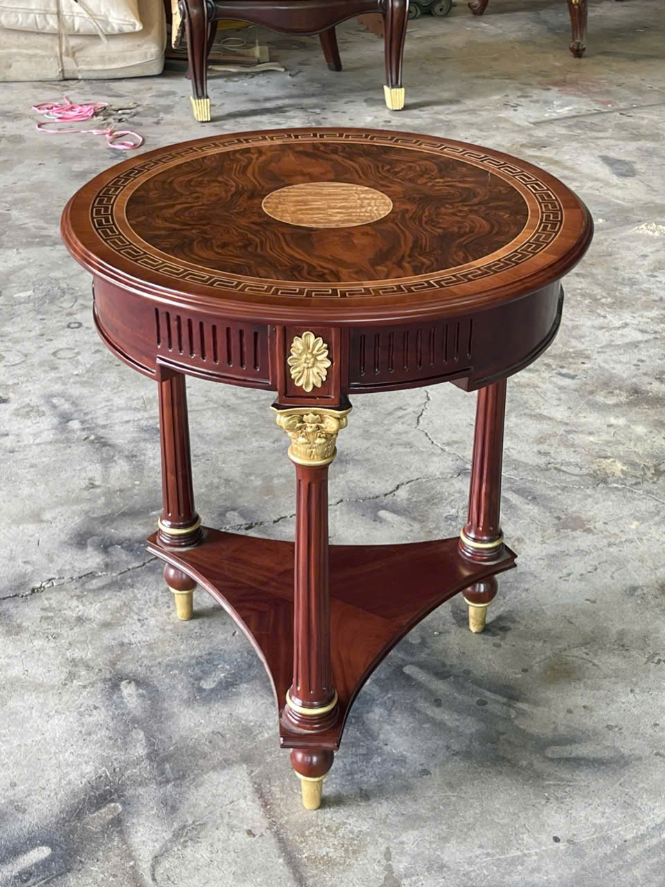 Chiếc bàn trà góc tân cổ điển Louis 16 sở hữu thiết kế tân cổ điển tinh tế, mang đậm hơi thở châu Âu sang trọng. Mặt bàn tròn được chế tác từ gỗ tự nhiên cao cấp, nổi bật với vân gỗ xoáy đẹp mắt cùng họa tiết viền hoa văn Greek Key tinh xảo bao quanh, tạo nên tổng thể hài hòa và đầy cuốn hút.