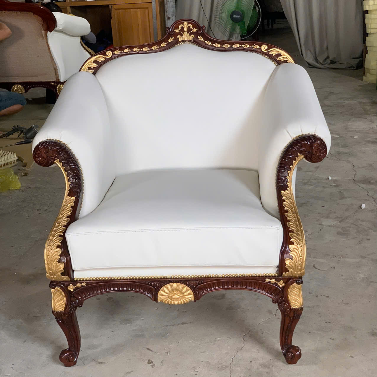 Sofa Althorp tái hiện tinh thần nội thất quý tộc châu Âu cổ, nơi từng chi tiết chạm khắc đều mang ý nghĩa biểu trưng cho sự thịnh vượng và quyền lực. Nét độc đáo nằm ở dáng sofa cong mềm, tay vịn cuộn cổ điển, chân ghế thanh thoát nhưng vững chắc, kết hợp kỹ thuật dát vàng thủ công – một giá trị nghệ thuật đòi hỏi tay nghề cao và thời gian chế tác tỉ mỉ.