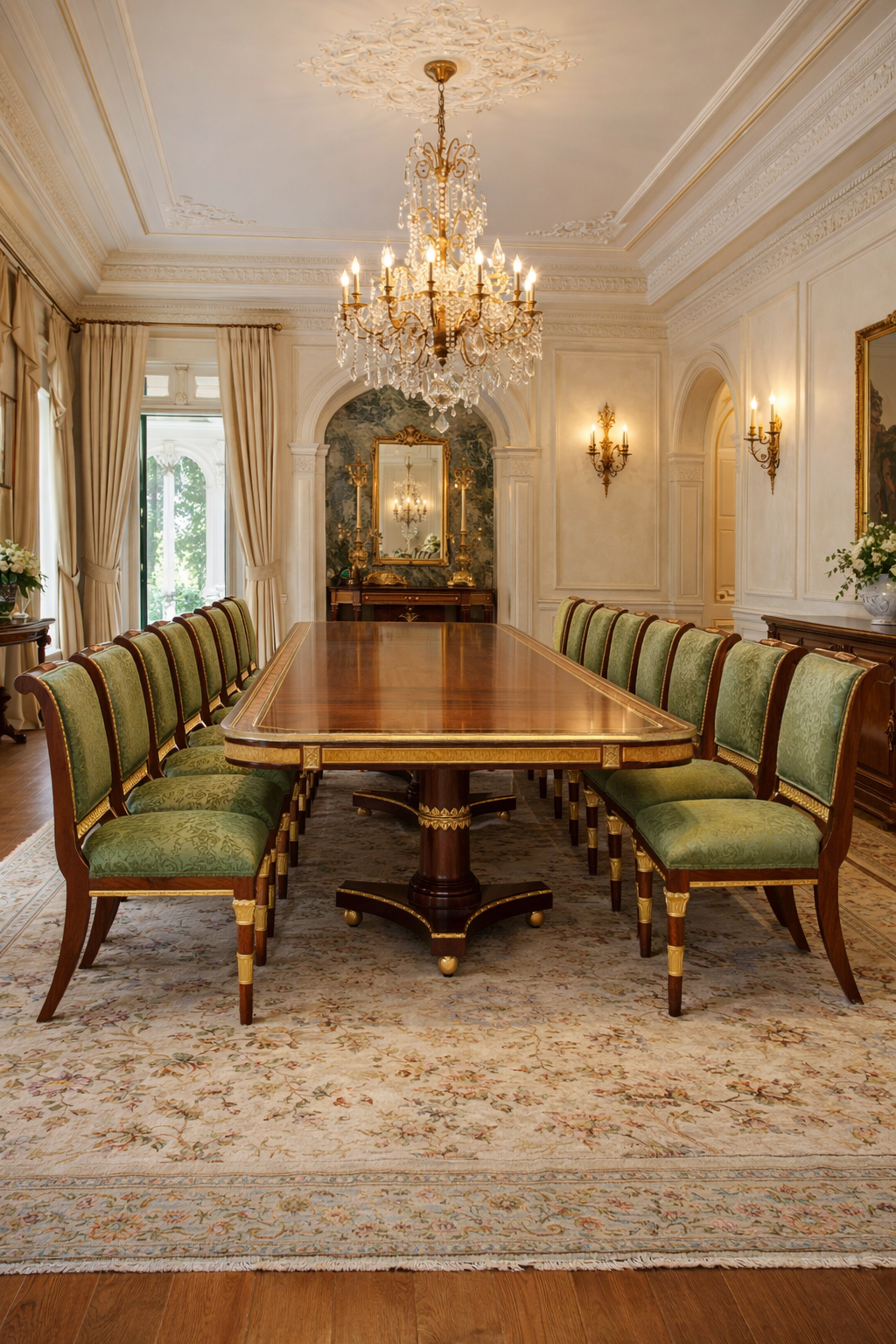 Chiếc ghế ăn cổ điển Wellington phong cách Ý mang vẻ đẹp sang trọng và đầy tinh tế, nổi bật với phần khung gỗ sơn đen huyền bí kết hợp chi tiết chạm mạ vàng thủ công ở chân và viền tựa lưng. Thiết kế lưng ghế vuông thanh lịch, bọc nệm vải hoa văn cổ điển tông xanh rêu trang nhã, tạo cảm giác êm ái và quý phái.